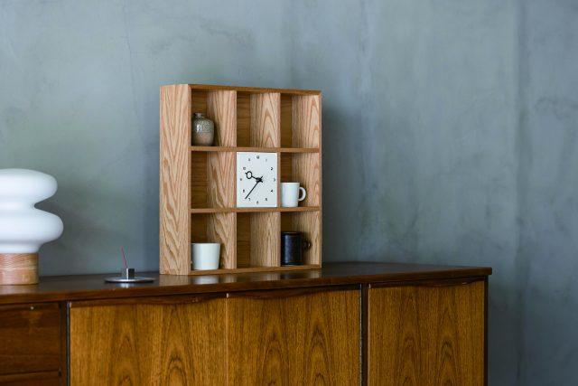 ウッドシェルフと時計がひとつになった家具のようなアイテム。