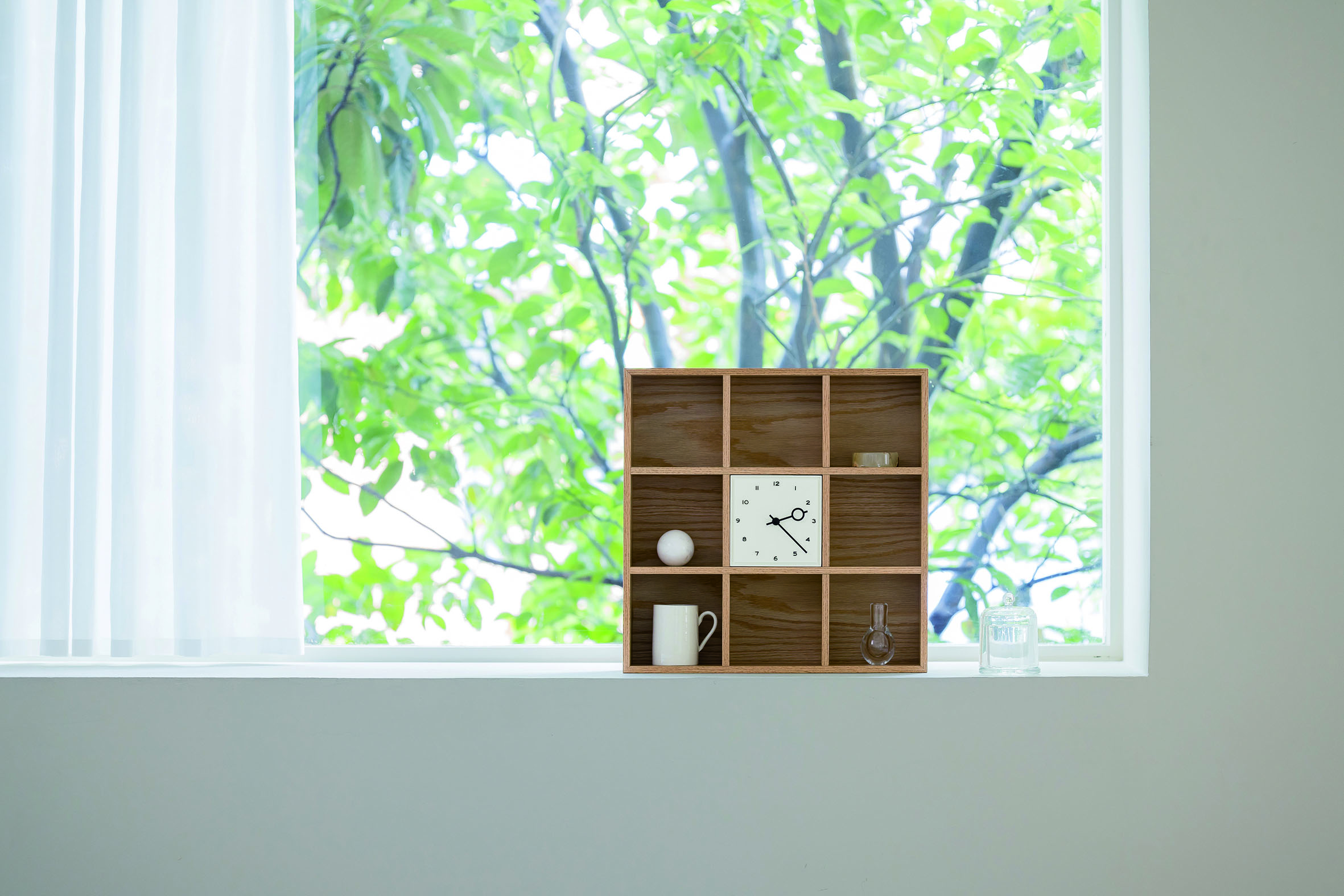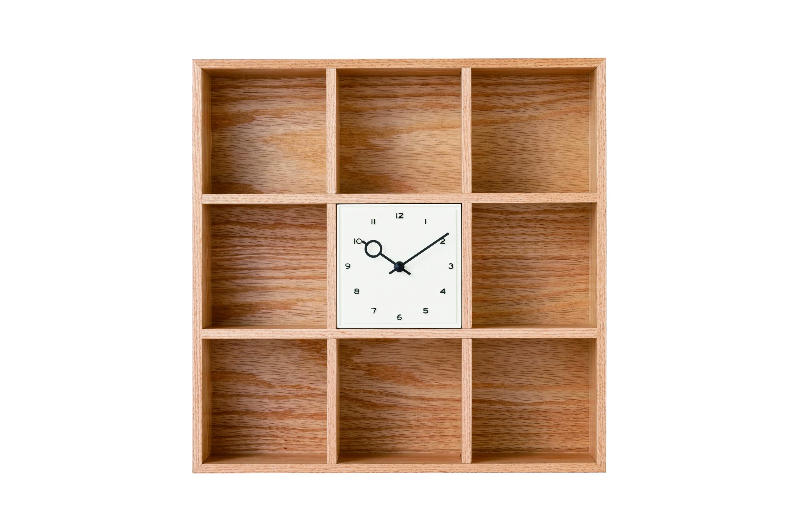 ウッドシェルフと時計がひとつになった家具のようなアイテム。