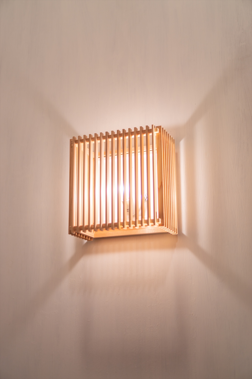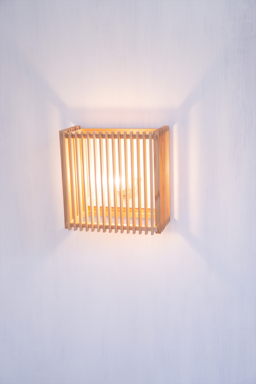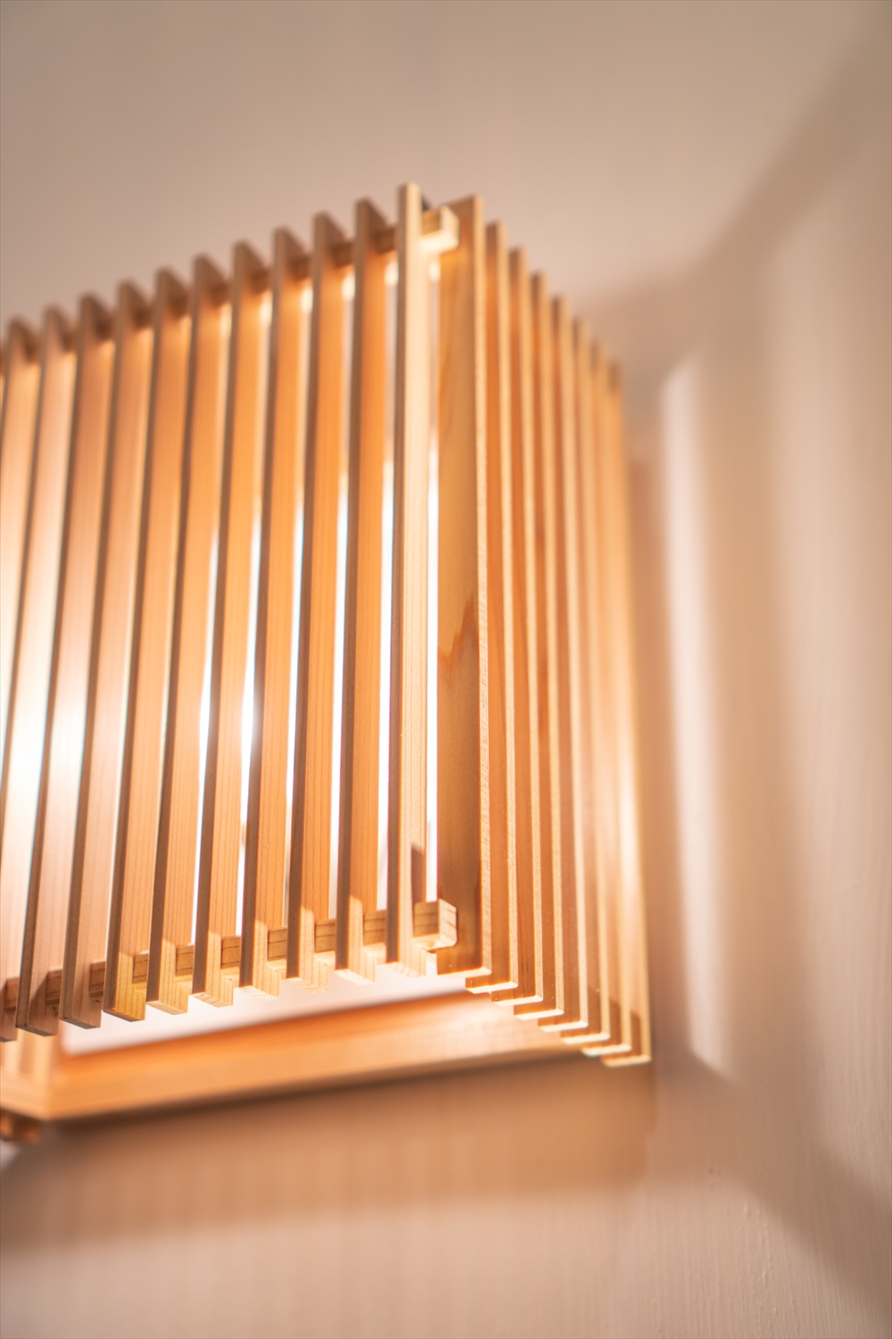 簾(ren) ホーム商品照明ペンダント照明簾(ren) 簾(ren) ワーロンを張らずに仕上げたブラケット。 縦格子の隙間から光が明るく広がります。 備考:シェードは自然の材を使って手作りされたものです。 その為、色・木目が写真と異なる場合がございます。 品番 AB619 素材 国産杉/民芸塗仕上/鉄博塗装(裏板) サイズ 巾215mm 高215mm 奥行125㎜ 仕様 E17 40W 白熱電球付 直付(要配線工事) 簾(ren) ¥22,000(税込) 数量