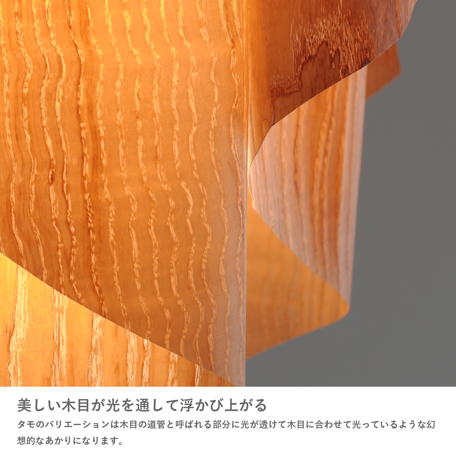 木目の道管と呼ばれる部分に光が透けて、幻想的な灯りを演出します。
