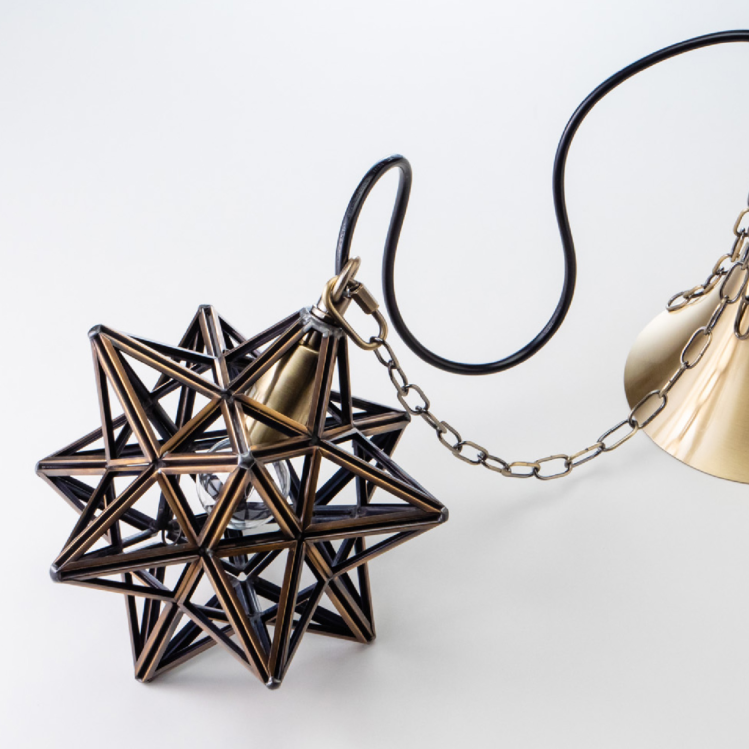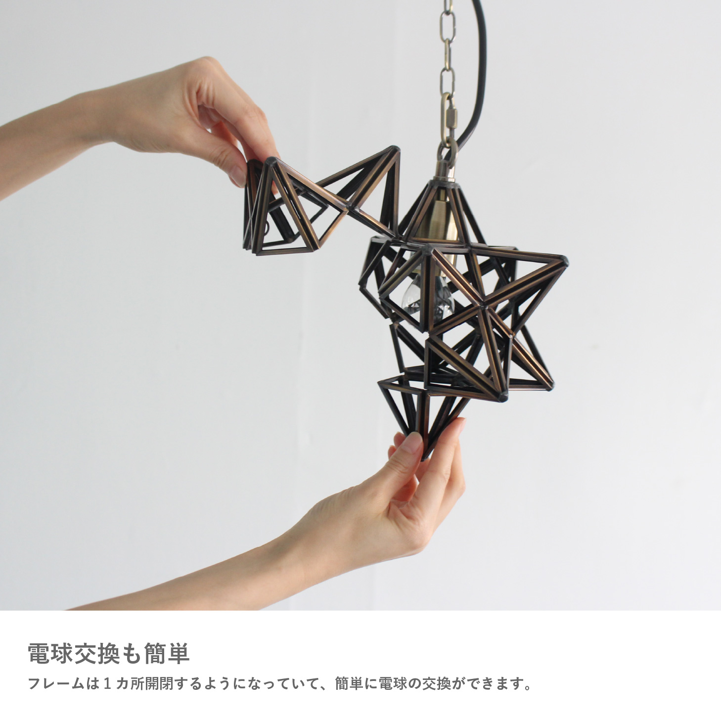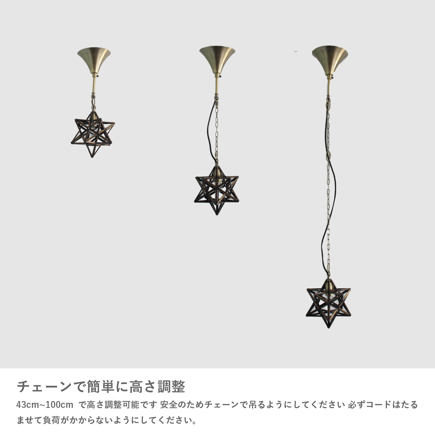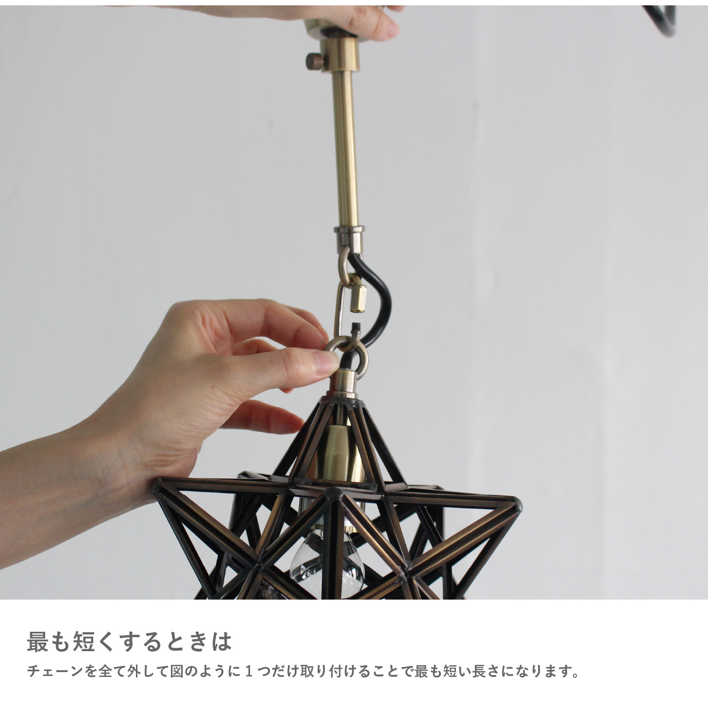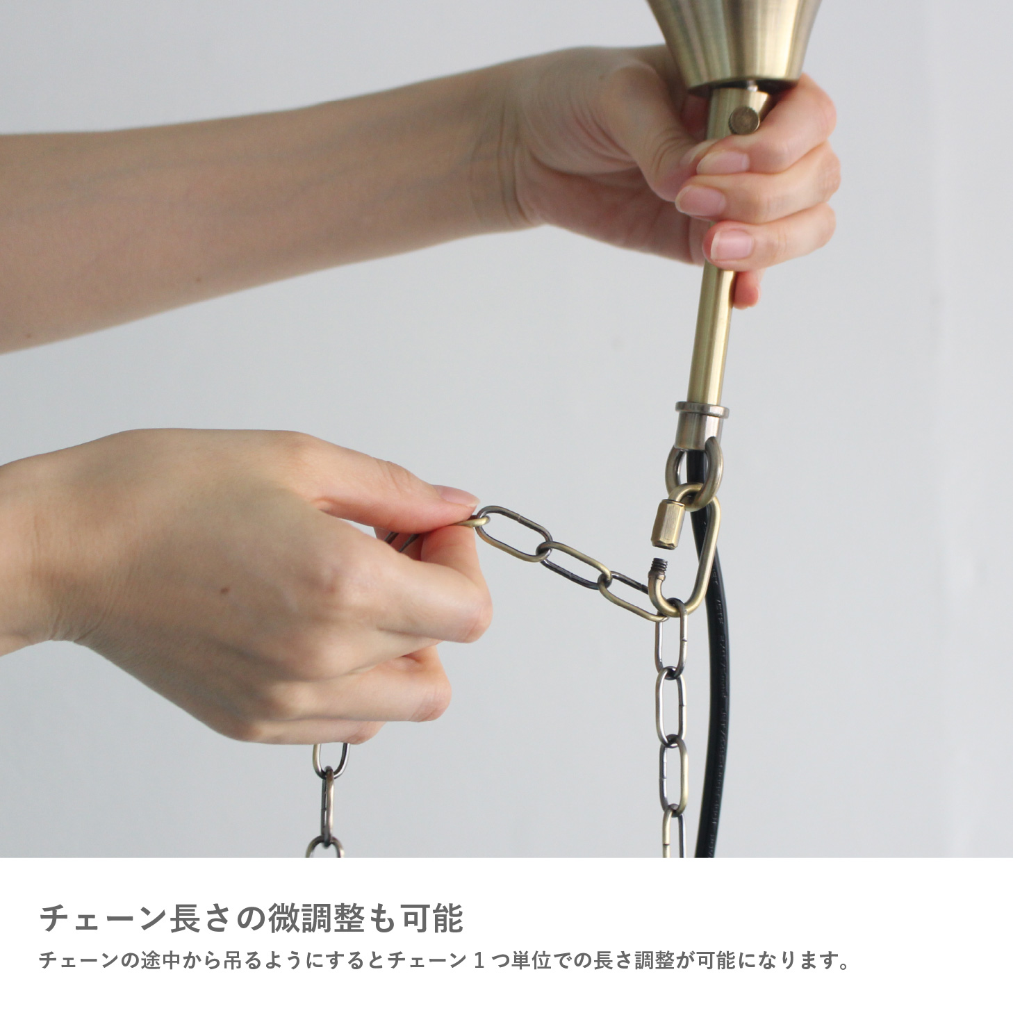 | 仕様 | 付属電球:E-17 40W ボール球(クリアー) 仕様 :引掛けシーリング チェーン吊り 注意 :LED電球使用時は外観(影や光の出方等)が白熱球使用時と 異なる場合があります 金属の本来の風合いを生かしたデザインのため、 色・仕上がりには若干の個体差がございます 時間の経過と共に金属の色・風合いが少しずつ変化します 付属のLED電球は調光対応不可です |