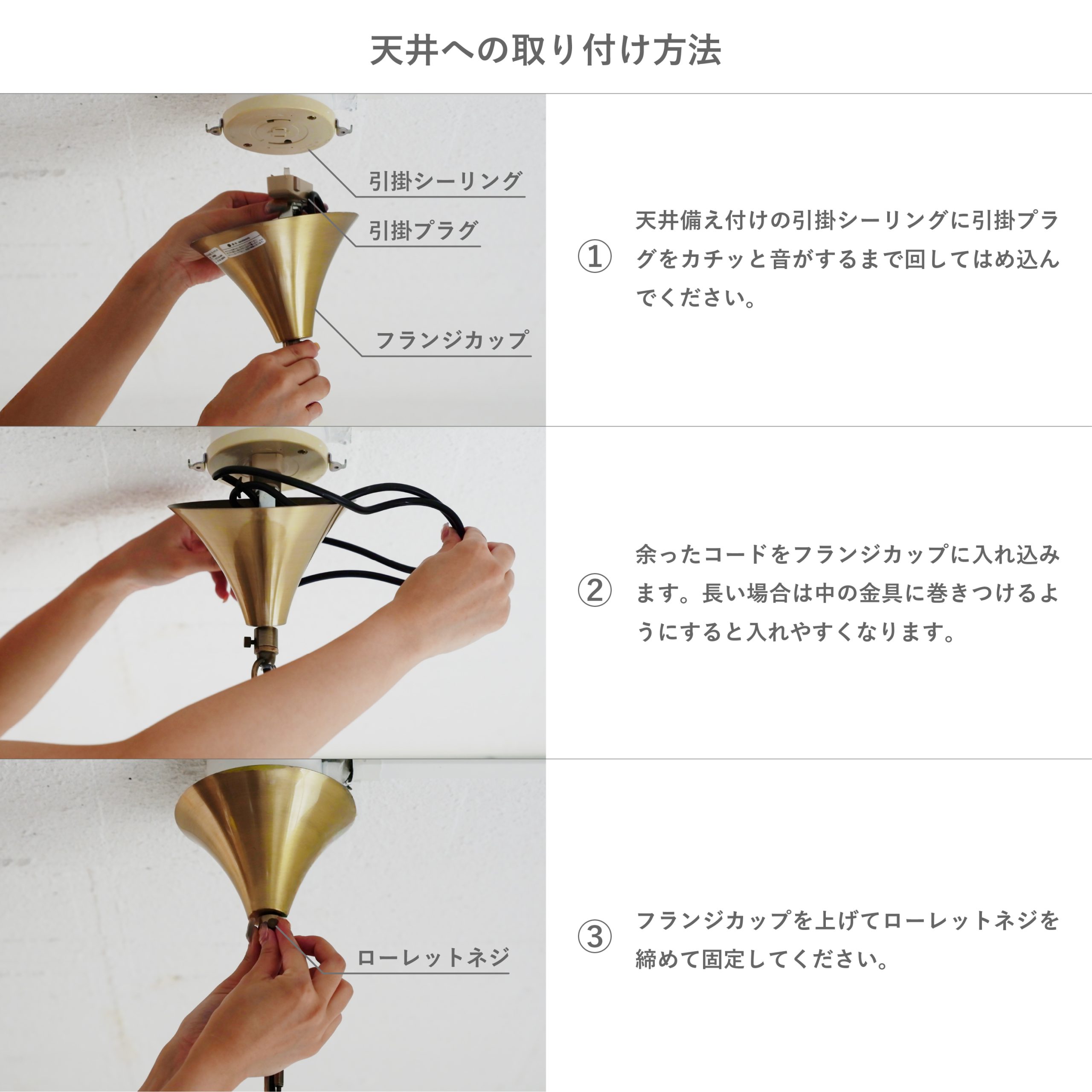 それぞれフランジとシェードにカラビナで繋ぎます。(この状態で届きます。) 短くする場合、チェーン①または②を外します。