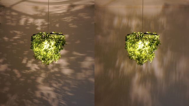 点灯すると葉の隙間から木漏れ日のような光がこぼれ、壁には葉の影が映し出されます。