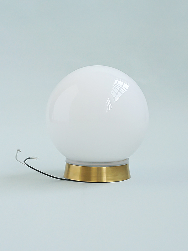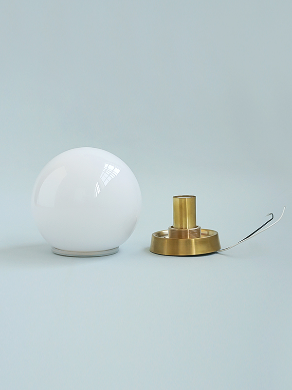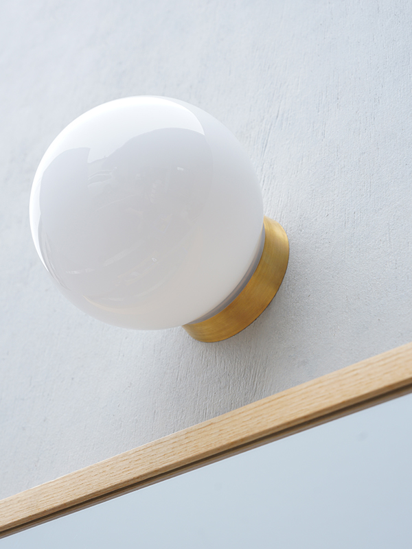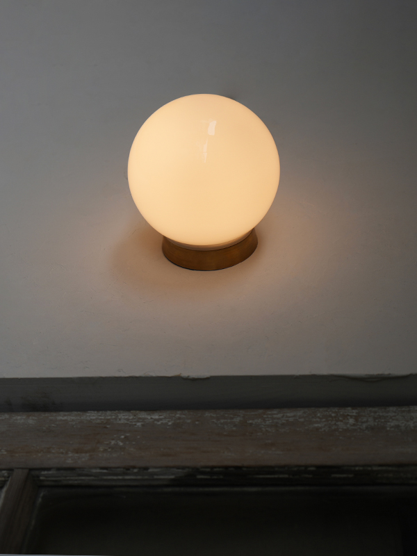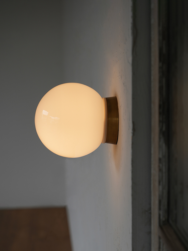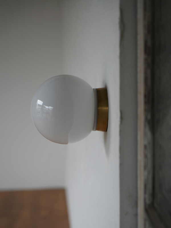 真鍮の台座とホワイトガラスシェードを組み合わせた、壁/天井両用のエントランスライトです。