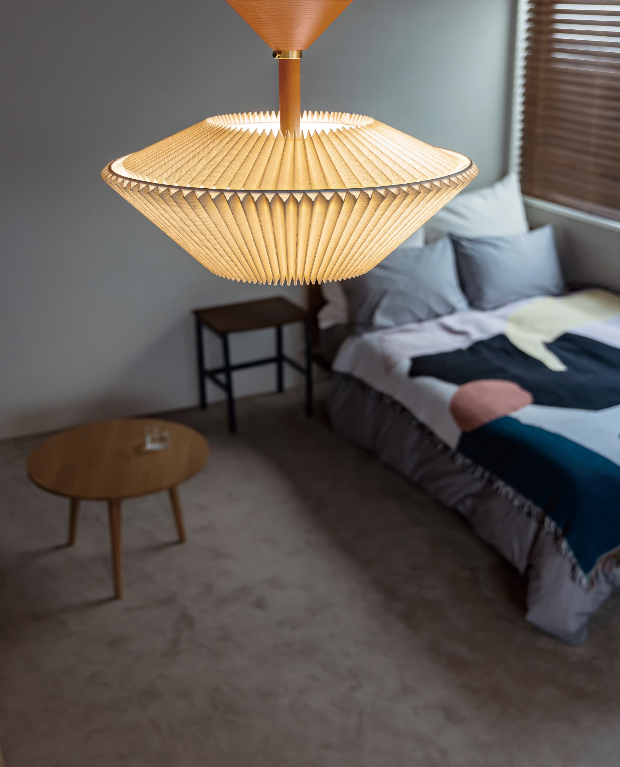 規則正しい陰影を生み出すプリーツセードを上下に重ねた、和傘にインスパイアされた工芸品のようなデザイン。