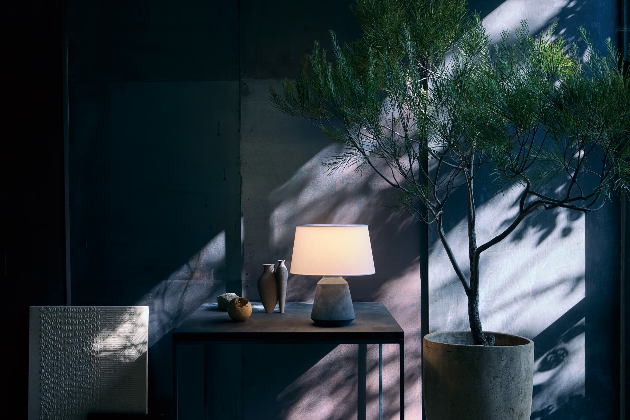 風合いのあるシェードに陶器のベースを組み合わせた自然テイストのテーブルランプ。2種類のフォルムでそれぞれベーシックな(S)サイズと存在感のある(L)サイズをご用意し、清潔感のあるホワイトシェードにはグレーのベースを雰囲気あるナチュラルシェードにはベーシュのベースをチョイスしシンプルデザインでモダンに仕上げました。シェードトップにはカバーを配し柔らかな明かりが優しい配慮で、関節光硬化のあるリラックス空間を演出します。