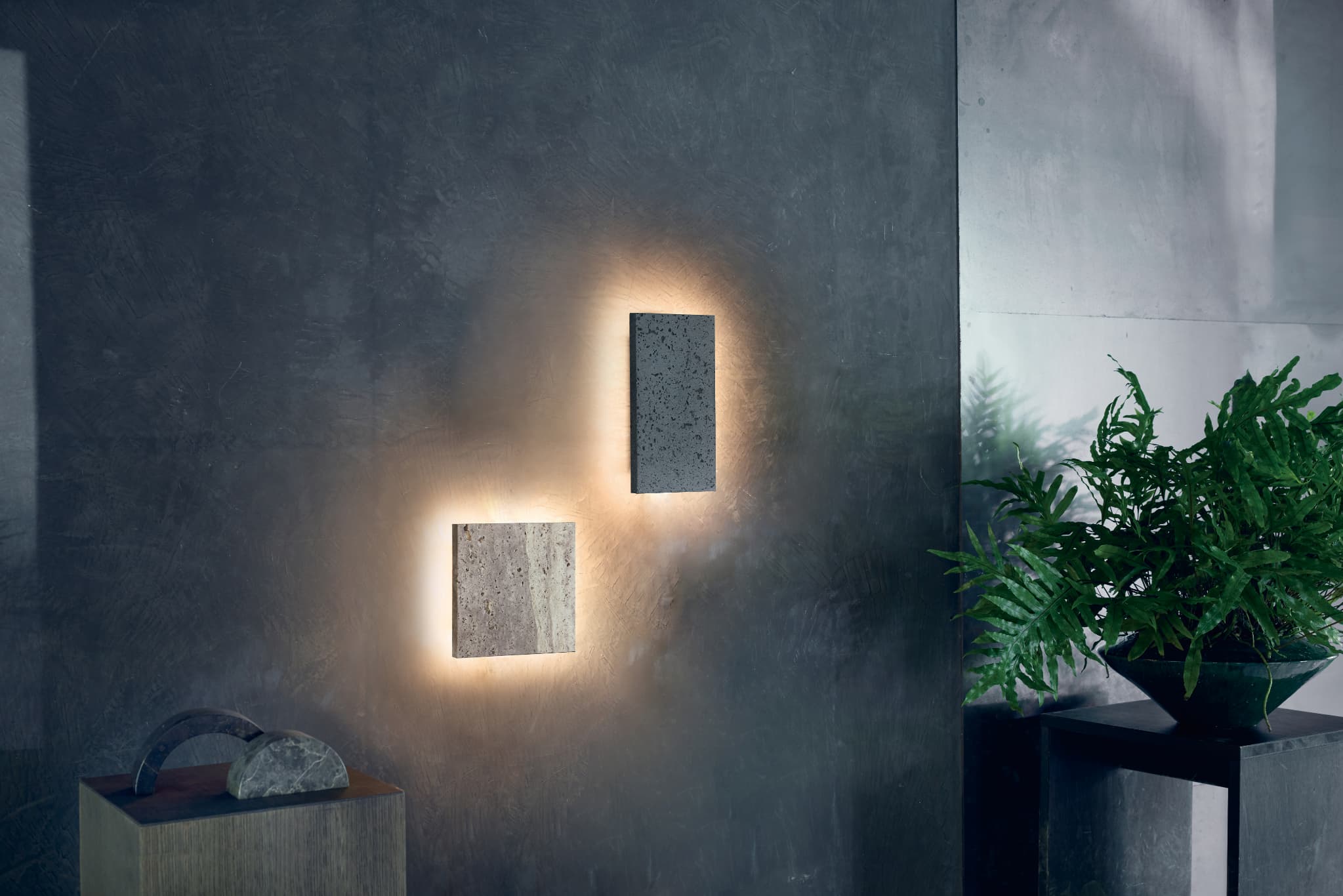 柔らかで上品な雰囲気をもつ天然石を贅沢に使用し、本体の裏側から壁面を優しく灯すウォールライト「Noir LED-wall light」温泉や地下の湧水より長い年月を経て